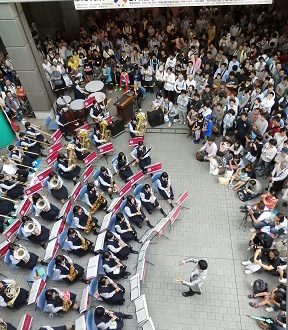 音楽部 ボビーショーで演奏 2015年5月16日 平成27年5月16日(土)・17日(日)に行われた第54回静岡ホビーショーで、演奏を行いました。たくさんの観客に囲まれ、とても楽しい演奏会となりました。