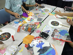 美術部は、昨年度同様、今年も講座をもたせてもらいました。「ちぎってペタペタ!あおいでパタパタ!作るオリジナルうちわ」と題して、ちぎり絵によるうちわ作りを行いました。セイトさんが来てくれるか心配でしたが、25名近くの方が参加してくださり、教室は大盛況でした。