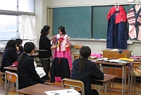 韓国語講座で、今日は韓国文化について学習し、韓服の着付けを体験しています。