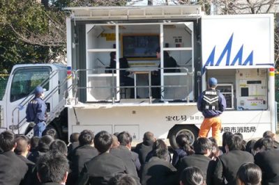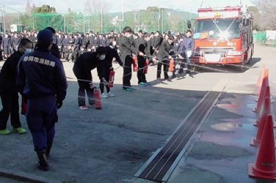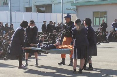 防災訓練 2017年12月19日 平成29年度 第4回の防災訓練を行いました。 校内自主防災訓練計画に基づき、消防署職員にご指導いただき、1、2年生は消火器の使用方法と起震車体験、3年生は煙体験と応急担架の作り方を中心とした防災訓練を行いました。体験をとおして防災意識を高めることができました。