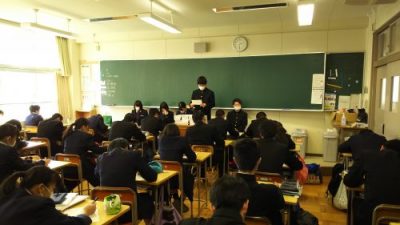 3年生と進路懇談会 2018年2月7日 3年生が1・2年生の教室で進路懇談会を行いました。 各クラスに進学と就職の代表者が入り、進路を決定するまでの経緯や、進路実現までに頑張ったこと、心掛けたことなどを話してくれました。また、やっておくべきことを2年、3年、試験前など時期ごとのアドバイスは具体的で、1・2年生はメモを取りながら話を聴いていました。