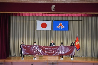本校創立120周年に合わせ、同窓会企画について紹介がありました。その中の1つである、横断幕が学校に贈られました。本校の正門付近の壁面に設置されております。