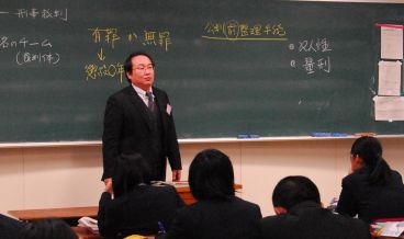 検察広報官をお迎えして法教育出前講座 2010年1月12日 1年生を対象に、全2回 第1回目は、ルールとは何か? ~法はなぜ守らなければならないのか~ (起訴されるまでの過程や時効、裁判などについて) 第2回目は、裁判員制度について、講義が行われました。