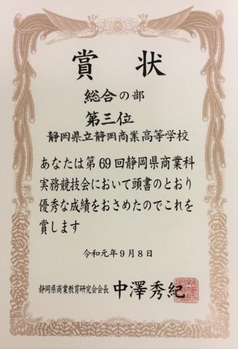 第69回静岡県商業科実務競技会 第3位 2019年9月8日 9月8日(日)静岡産業大学藤枝キャンパスにおいて、第69回静岡県商業科実務競技会が行われました。静岡県内の商業を学ぶ22校の学校の生徒が、8部門(珠算、電卓、簿記、英文ワープロ、ワープロ、速記、情報処理、商業デザイン)に分かれて日頃の学習の成果を競いました。 総合の部 第3位 簿記、ワープロ、英文ワープロ、情報処理Aの部門が東海大会出場を決めました。