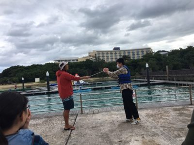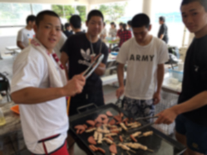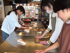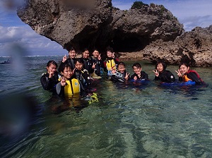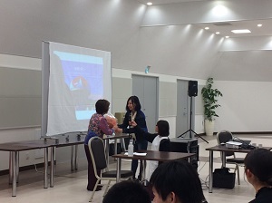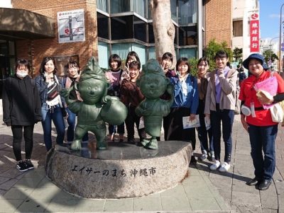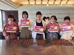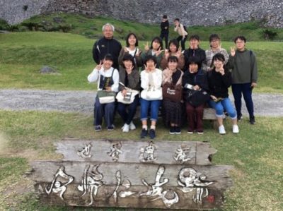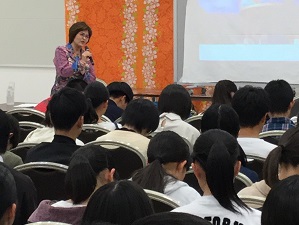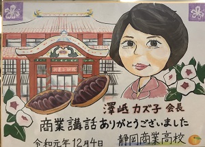 夕食後、御菓子御殿会長の澤岻 カズ子(たくしかずこ)さんに商業講話をしていただきました。 紅芋タルトの誕生秘話や、地元に根差した商品開発など、とてもためになる話をしていただきました。 講話の最後に花束と、本校の生徒の書いた色紙をプレゼントすると大変喜ばれていました。 また、澤岻 カズ子会長から本校生徒全員に焼きたて紅芋タルトのプレゼントをいただきました!