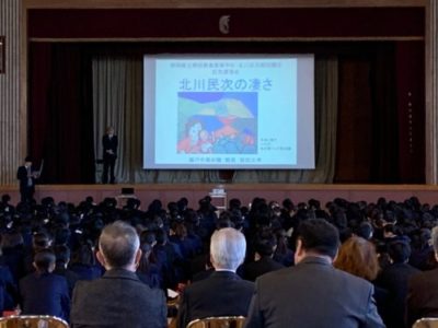 「北川民次」作品 同窓会より贈呈 2019年12月18日 令和元年12月18日、静岡商業高校を明治43年に卒業され、その後アメリカーメキシコに渡り、日本画壇の重鎮となられた、北川民次氏の油彩画1点と版画14点が、同窓会(会長 赤石文男)より学校に寄贈され、贈呈式、記念講演会が行われました。 北川民次絵画・贈呈式 記念講演会講師 瀬戸市美術館館長 服部 文孝氏