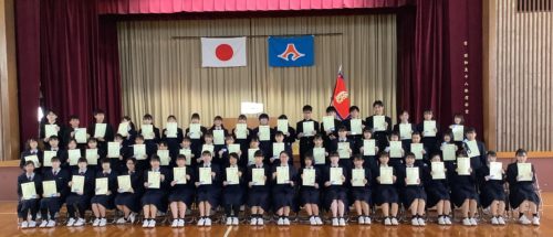 3年生57名が検定試験で三種目以上の1級取得 2021年2月26日 3年生57名が、全国商業高校協会主催の検定試験で三種目以上の1級を取得しました。内訳は、八種目に1名、七種目に2名、五種目に4名、四種目に14名、三種目に36名が合格しました。2月26日に、同協会から表彰を受けました。 五種目以上取得