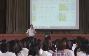 コース選択説明会 2011年7月6日 1年生とその保護者を対象とした、コース選択説明会を実施しました。 コースの特色と学習内容、目標とする検定試験の違いについての全体会が行われた後、商業科と情報処理科に分かれて、さらに細かい学科の特徴について説明がありました。