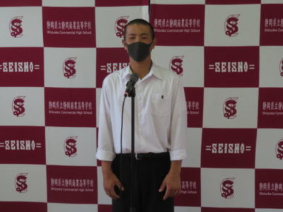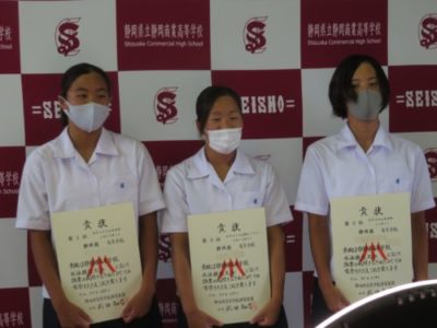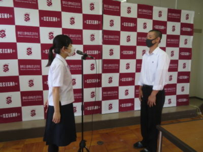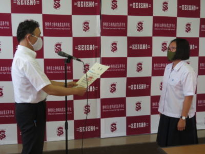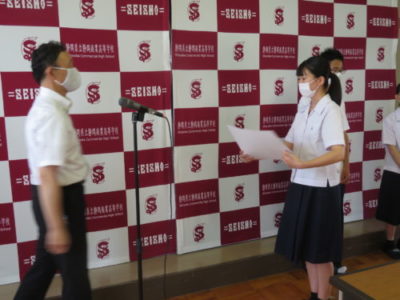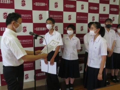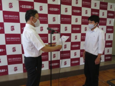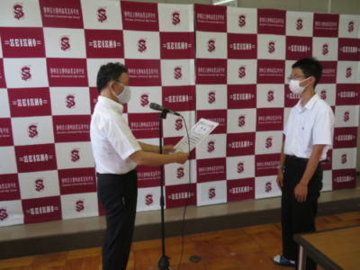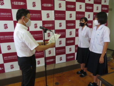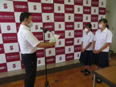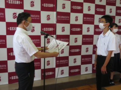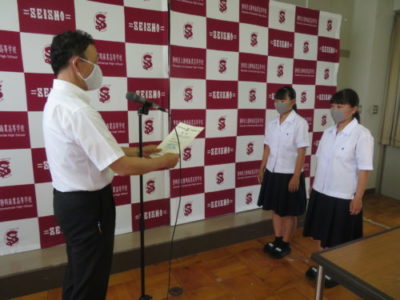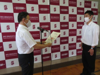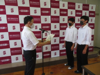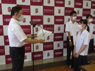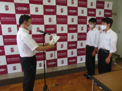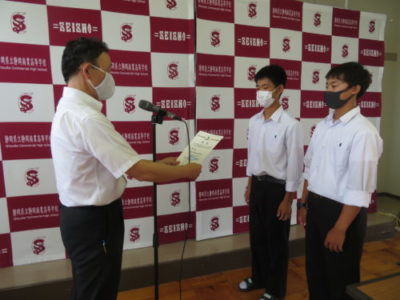 表彰壮行会を行いました 2021年6月28日 今年度6月までの大会で見事な活躍をした生徒たちが表彰されました。引き続き行われた壮行会では、次に開催される大会に向けての意気込みが発表され、校長先生と生徒を代表して生徒会長から激励を受けました。