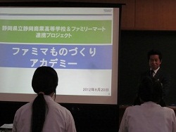 ファミマものづくりアカデミー 2012年9月21日 ~ファミリーマート連携プロジェクト×静商~ 株式会社ファミリーマートの商品開発チームの方々を講師にお招きし、地域密着プロジェクト「ファミマものづくりアカデミー」の講義をしていただきました。 今年度、課題研究(商品開発)の授業で新商品を開発する3年生が受講しました。 参加した生徒は、今後も商品開発・発売をすることを通して、小売業、製造業、流通業について学んでいきます。