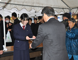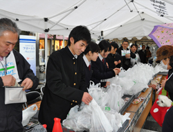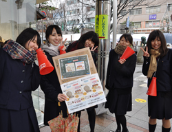コラボパン販売日前日イベント 2013年1月14日 1月14日(月)【販売前日イベント 】 青葉シンボルロードにて静商生のパン販売 雨にも関わらず多くのお客様が来てくださり、無事1000セット完売することができました。誠にありがとうございます。 静商生の活気あふれる販売は、テレビや新聞でも話題となりました。 当日の売上金額全額は、児童養護施設に寄付いたしました。 当日の売上金額全額は、児童養護施設に寄付いたしました。