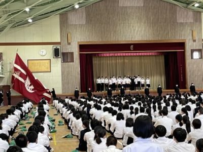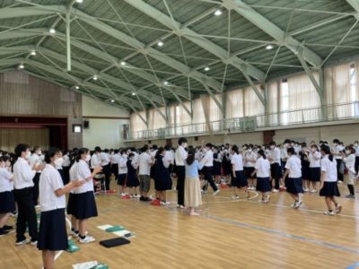 表彰・壮行会 2022年6月8日 表彰式の後、東海大会に出場する軟式野球部、男子ソフトテニス部、女子ソフトテニス部の壮行会を体育館で行いました。選手は花道を通り壇上へ。校長先生、生徒会長からの激励のことば、全校生徒からはエールを送られました。各部の代表は大会に向けた決意を表明しました。