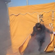 煙体験は頭を低くしハンカチで口を覆って避難。