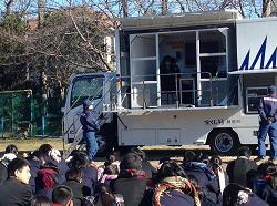 火事を見つけたら、大きな声で「火事だー!」消火器を手にしたら逃げ道に背を向け消火。起震車体験では大きな揺れに恐怖を感じる生徒も。
