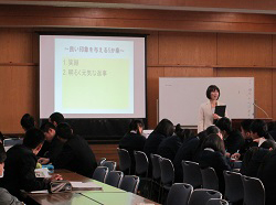 マナー講習会 2015年2月6日 2年生のマーケティングコース選択者を対象に、講師をお迎えしてマナー講座が行われました。 2月12~13日に行われる販売実習に向けて、礼儀作法(言葉遣い、身だしなみ、態度など)をしっかりと確認しました。