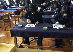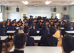 芸術合同発表会開催 2015年2月24日 2/18、2/24の音楽Ⅰ、美術Ⅰ、書道Ⅰの時間を利用して芸術合同発表会を開催しました。お互いに1年の学習成果を見合う大切な場です。音楽はギターの合奏や合唱、書道はその場で色紙に自分の思いを込めた字を書きました。美術は生徒ホールに今までの作品を展示しました。それぞれの表現の違いを発見しつつ、違うからこそ「面白い!」ことを再認識する機会となりました。