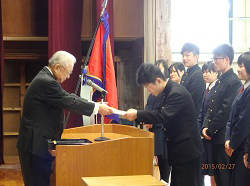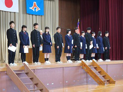 同窓会入会式 2015年2月27日 2月28日に第116回 同窓会入会式が行われました。 3月2日に卒業式を控えた3年生239名が、伝統ある静岡商業高校を支える同窓会に仲間入りしました。 少し緊張した様子で委嘱状を手にする各クラスの代表生徒たち
