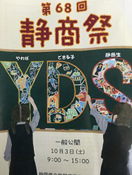 文化祭 開催 2015年10月3日 静商祭 文化祭開催 10月2日(金)に校内発表、10月3日(土)に一般公開が行われました。 【ステージ発表】 10:30~ 応援部(チアリーダー) 11:00~ 音楽部 今年もPTAバザーを開催しました。 今年もPTAバザーを開催しました。