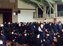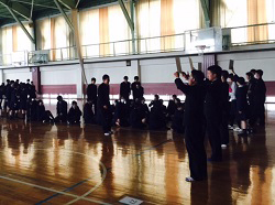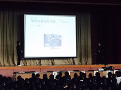抜打 防災訓練 2015年11月11日 生徒総会の前に告知なしの防災訓練を行いました。 突然の地震速報に戸惑いながらも机の下に身を隠し、避難開始の放送で体育館へ移動しました。 今回は、課題研究で防災を研究している生徒が、緊急速報の仕組みや発表時の対応について説明を行いました。