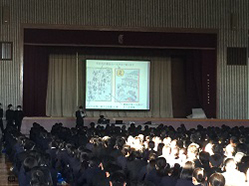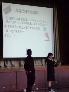 生徒研究発表 2015年12月17日 生徒発表会 3年生の課題研究の授業で、防災をテーマに研究している生徒が、これまでの研究成果を発表しました。 今年度作成した防災カルタや非常食(ローリングストック~非常食を効率よく保存するには~)など、それぞれのテーマで発表を行いました。