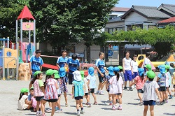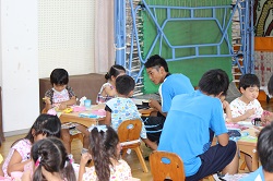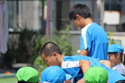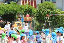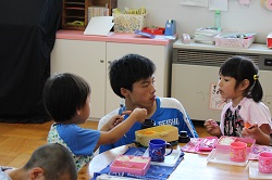 1年生 園児とランチタイム 2016年7月4日 1年生の参加希望者が、田町幼稚園で園児と一緒にお昼ご飯を食べ、楽しく遊んできました。 初対面ということもあり、お互いに緊張しながら始まったランチタイムでしたが食べ終わるころには園児の顔にも笑顔が。食後は外で元気にボール遊びをしました。