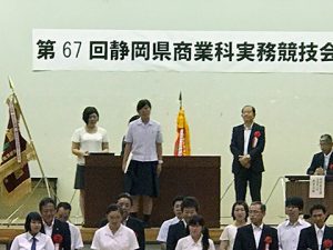 9月2日(土)静岡産業大学藤枝キャンパスにおいて、第67回静岡県商業科実務競技会が行われました。静岡県内の商業を学ぶ22校の学校の生徒が、8部門(珠算、電卓、簿記、英文ワープロ、ワープロ、速記、情報処理、商業デザイン)に分かれて日頃の学習の成果を競いました。