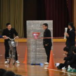 12月20日、全校生徒を対象に、交通指導員による交通安全教室を行いました。 危険な運転や運転上の注意などを、体育館で実際に自転車を走らせながら体験しました。自転車事故が多い時期、ルールとマナーを再認識するよい機会となりま …