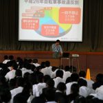 交通安全指導員、静岡県自動車学校のご協力を得て、全校生徒を対象とした、交通安全教室を行いました。体育館に交差点を再現し、実際に自転車を走らせ、どの自転車のどの行為が危険なのか、どのようにしたら危険を回避できるのか、一つ一 …